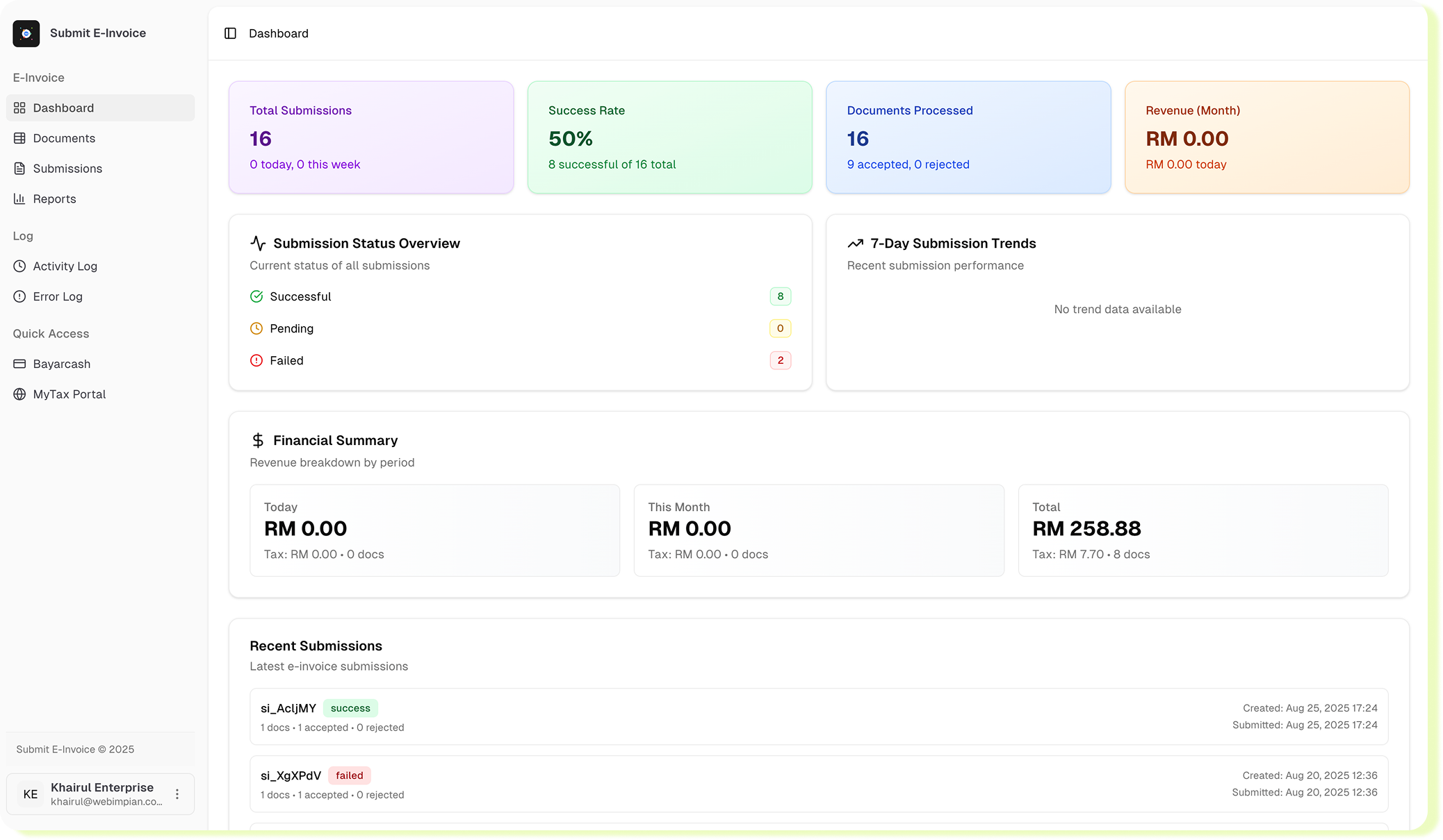 SubmiteInvoice is a middleware that connects your platform to LHDN’s MyInvois — simple, secure, and efficient.